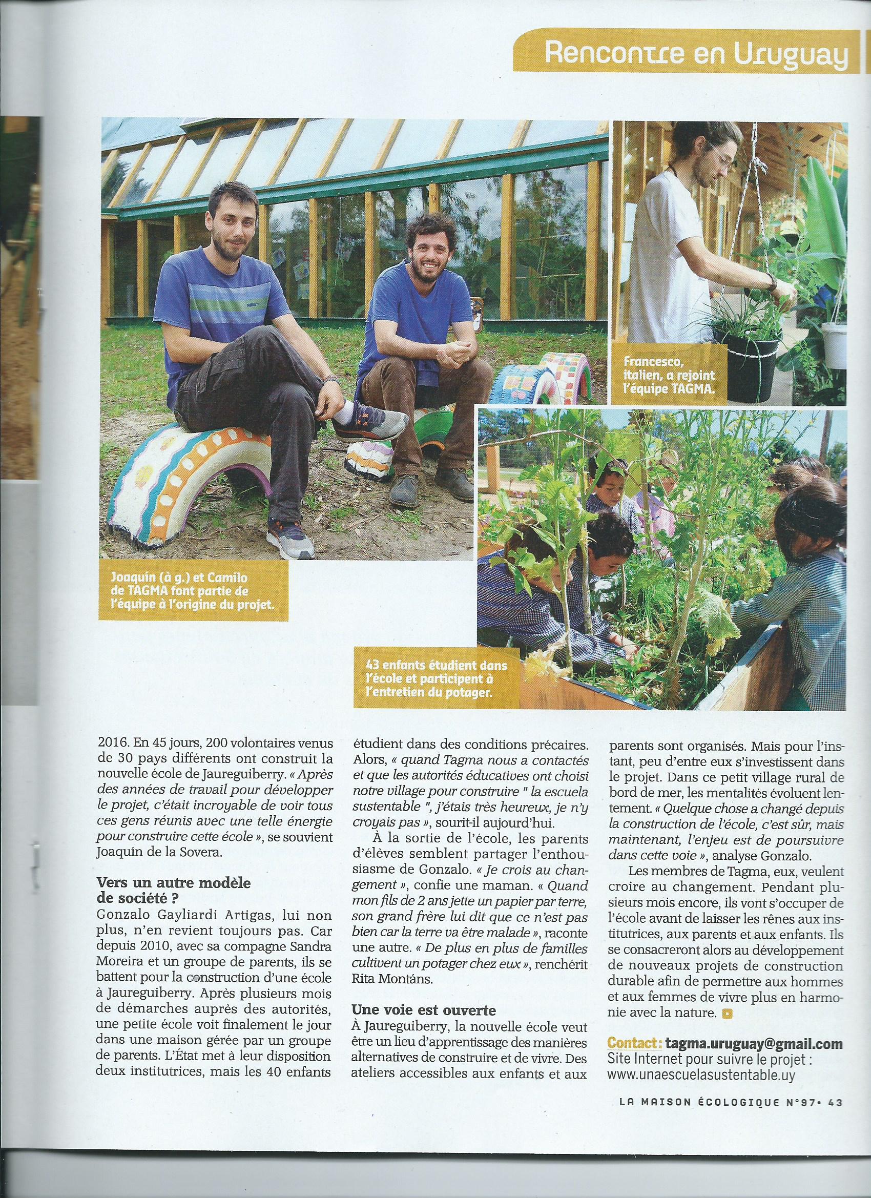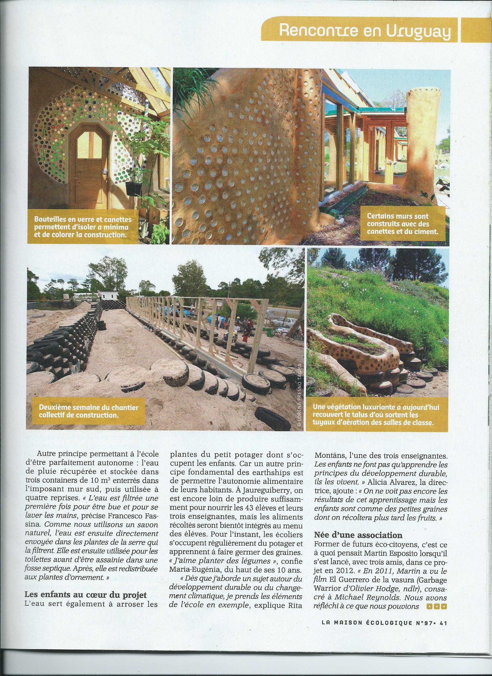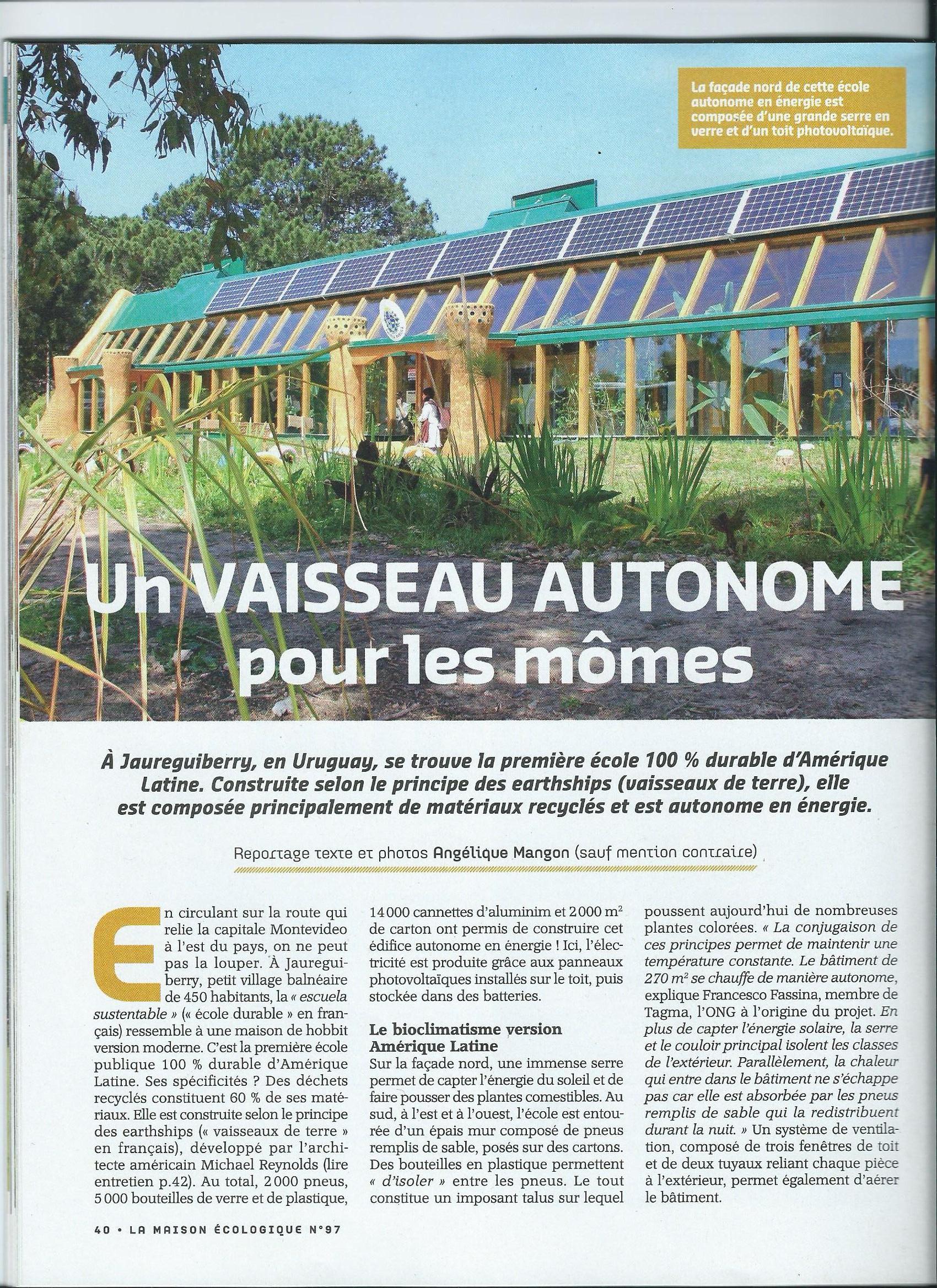 En octobre dernier, j’ai trainé mon sac à dos jusqu’à la petite ville côtière de Jaurreguiberry en Uruguay. J’avais pris contact avec l’ONG TAGMA qui y a construit la première école autonome en énergie d’Amérique Latine. Comme mon espagnol n’était pas encore très au point, j’avais bien potassé tout le vocabulaire technique. C’était mon premier article pour le magazine La maison écologique. Pas question de se planter !